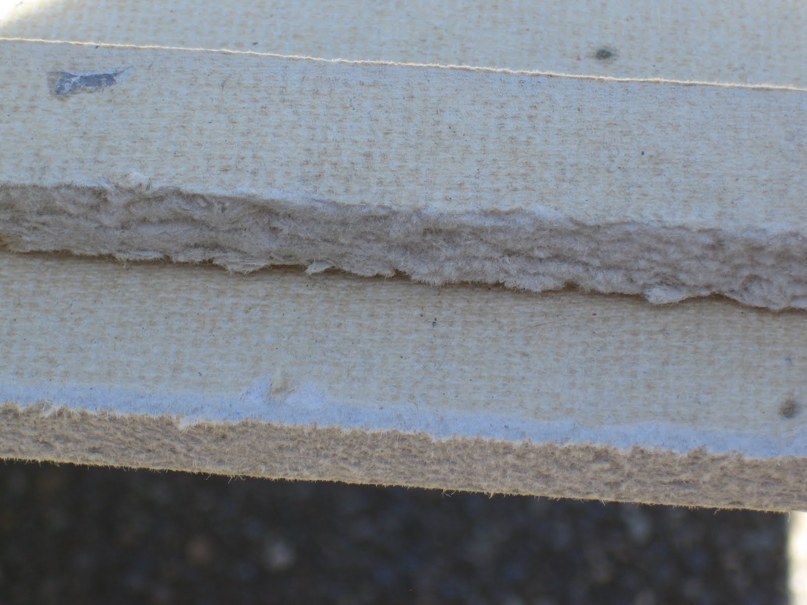 And here is how we made it. Step One: Order the Homasote board from a reputable lumber place that will special order it in for you. You should be able to get a good sized piece for $40 or under. Ours cost $35 for a 4 x 8' sheet. They may do special size cuts for you, or it may be a standard size when it arrives and you may have to cut it down to fit your particular wall area. In our case, they helped cut it roughly to size. Both my husband and I are making boards for our separate rooms and he did do some cutting to finish them off, as he had the special saw blade he needed to do so. It is messy to cut, as well as thick. It's made out of compressed recycled paper type material. It cannot get wet or it will swell up. (Edited to add: I believe I am partially wrong on this. Thanks to Ellen's comment, and after googling around, I see alot of knitters actually use the Homasote as a blocking board! So the slight dampness during blocking is OK. Maybe it is only not supposed to get super doused. I surely would like to use our extra piece as a blocking board. That makes me even happier!)